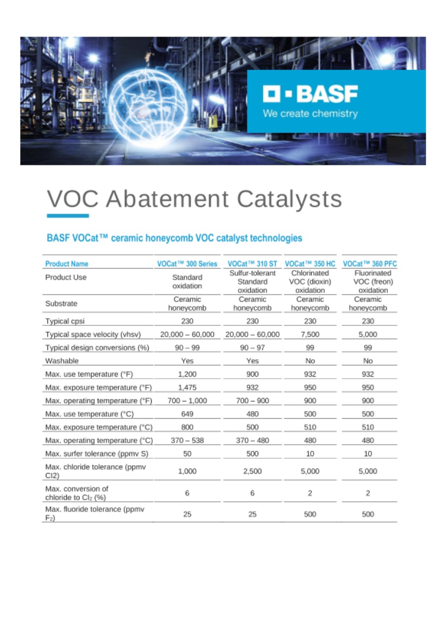 BASF Catalysts has long been a leader in the development of highly active, robust and selective catalysts and related technologies for the destruction of volatile organic compounds (VOC). While there are a number of methods to abate VOC emissions, catalytic incineration has become a leading choice because it can be more versatile and economical than other approaches.